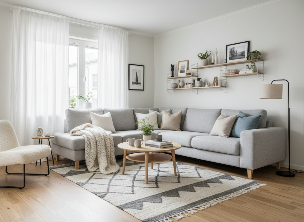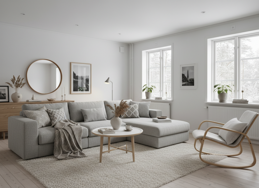 Дополнительно для сканди характерны чистые линии, минимум декора и «уют через текстуры» — пледы, подушки, ковры, тактильно приятные ткани.